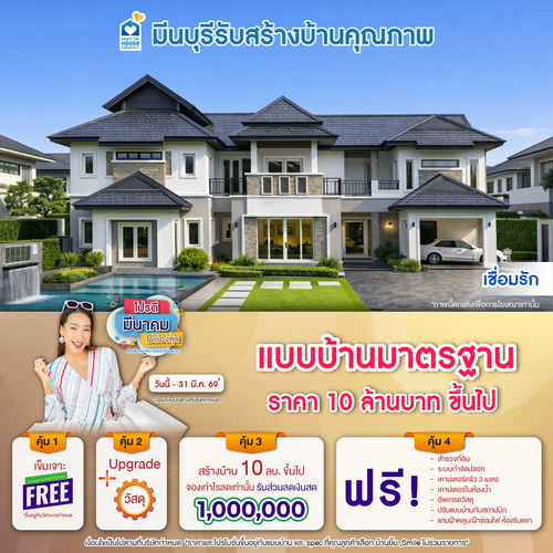 โปรดี มีนาคม ไม่ต้องลุ้น! แบบบ้านมาตรฐาน ราคา 10 ลบ. ขึ้นไป รับส่วนลดเงินสด 1,000,000 บ. อย่าพลาด วันนี้-31 มีนาคม 2569